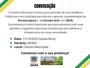 Convidamos todos os produtores que possuem lote nas estradas rurais Japurá e Xerê para participarem de uma Audiência Pública muito importante!