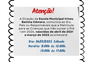 A Direção da Escola Municipal Irineu Batista Câmara comunica aos Srs. Pais ou Responsáveis que a Matrícula para as Crianças que irão cursar o Pré I em 2026, nascidas de abril de 2021 a março de 2022, acontecerá: